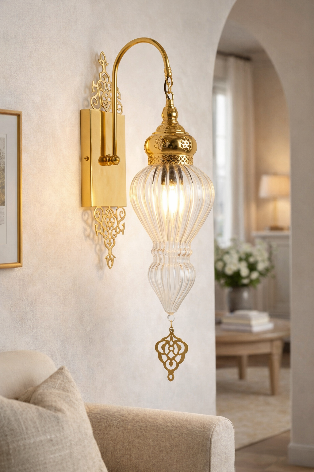 Handcrafted Turkish Wall Sconce - Luxury Gold Ribbed Glass Wall Light (23.6")