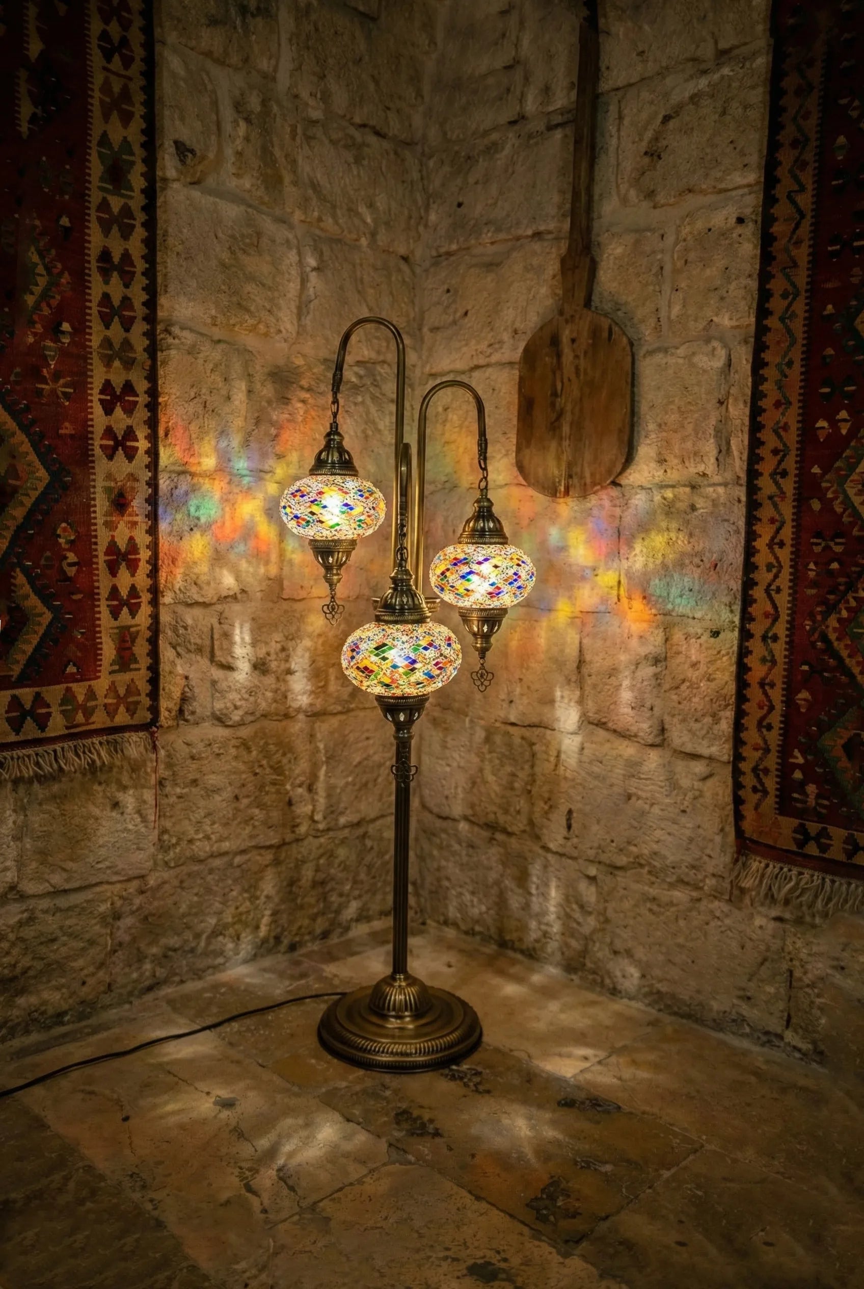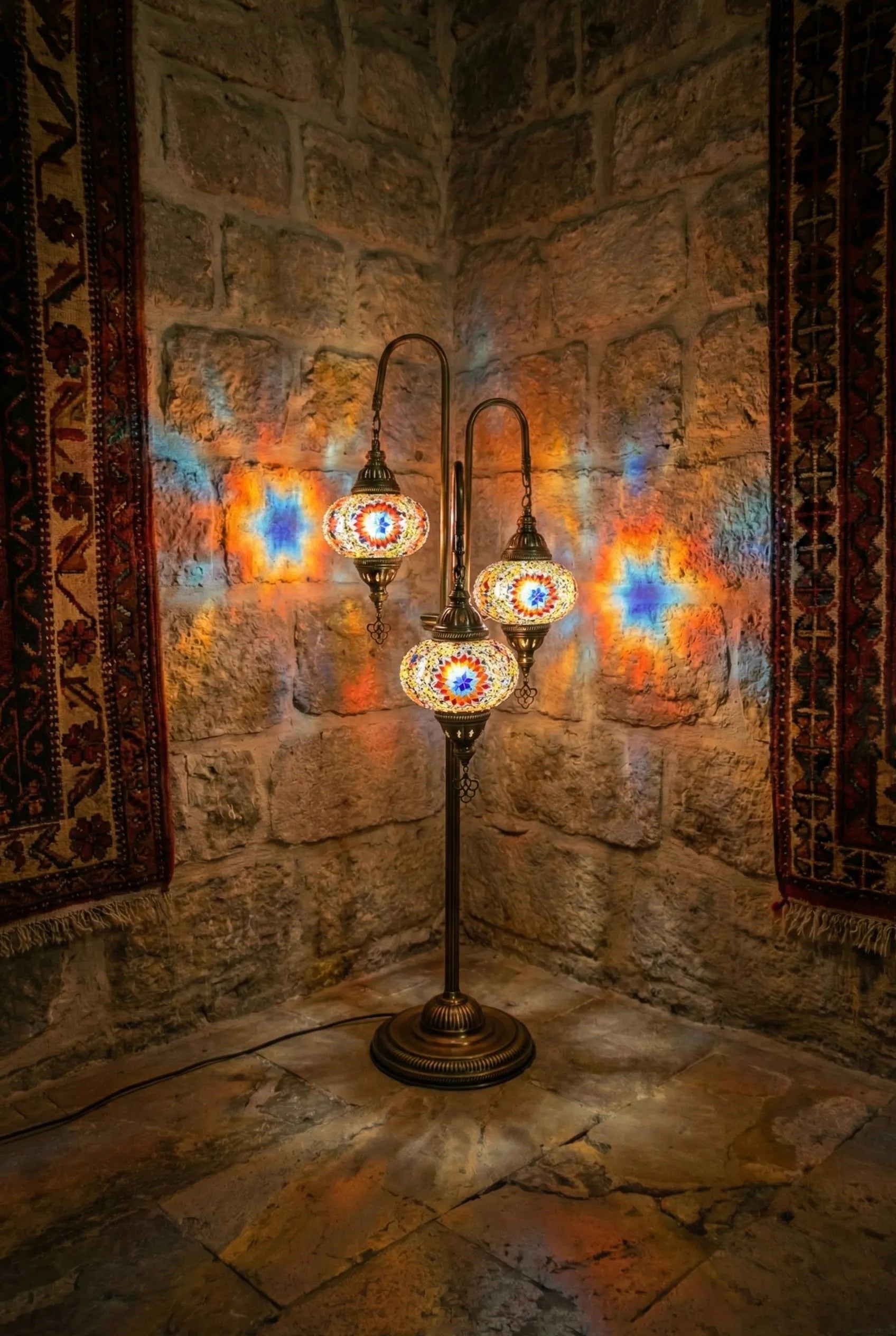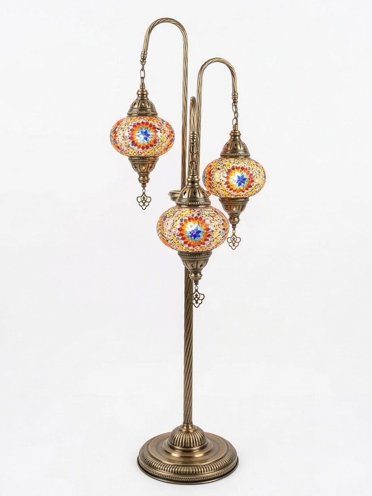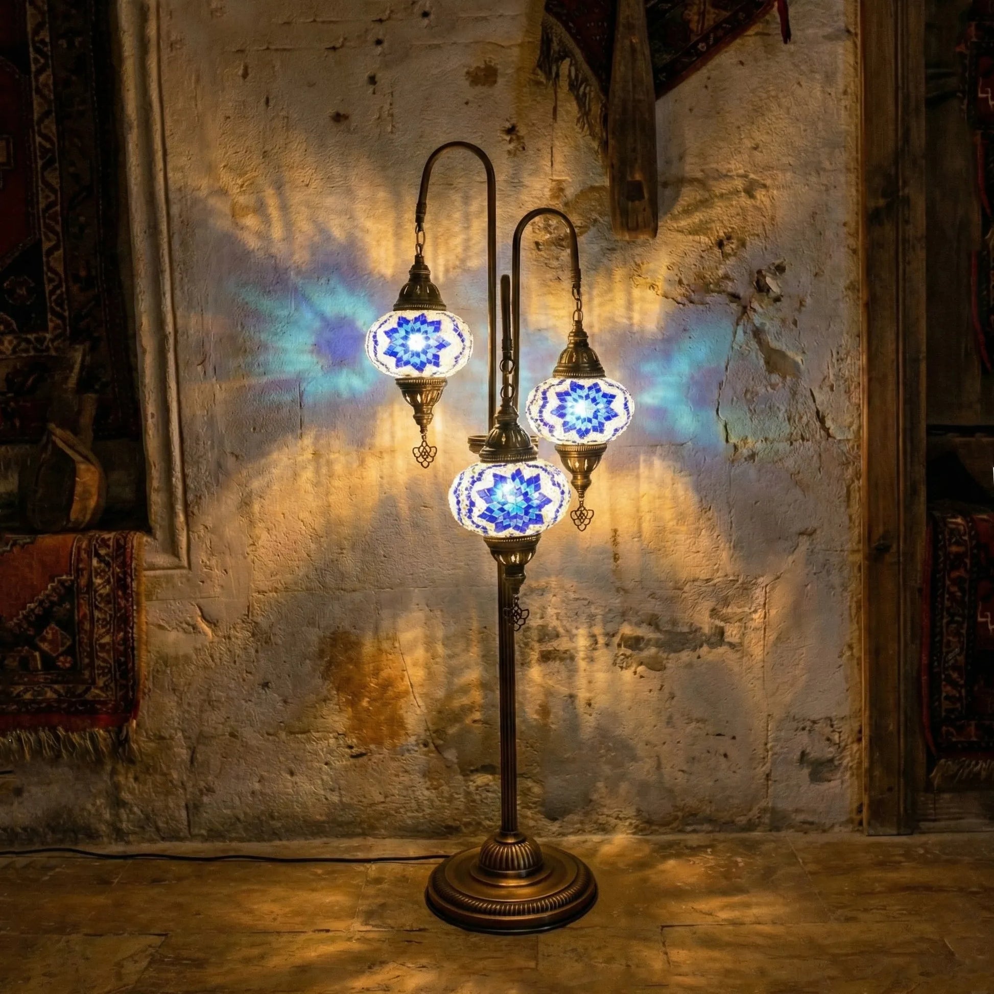 Transform your living space into an exotic sanctuary with the 3-Globe Turkish Mosaic Floor Lamp. This isn't just a lighting fixture; it’s a piece of history, handcrafted in the heart of Istanbul. Featuring three cascading globes of deep sapphire and celestial blue mosaic glass, it casts a mesmerizing, ambient glow that brings warmth and character to any corner.